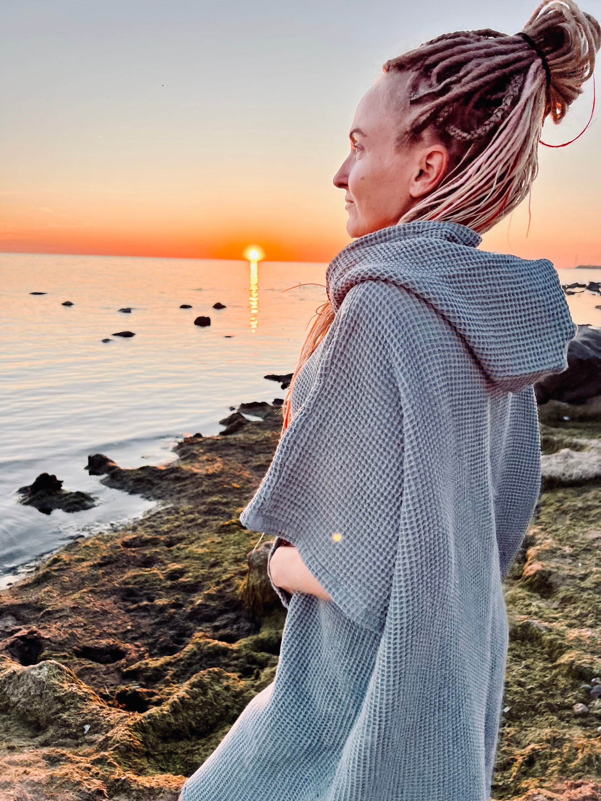 Kā sasildīties pēc peldes? Pančo! Ekselenta izvēle, lai žigli patvertos no vēja, ērti un slepeni! pārģērbtos, ieliktu pančo kabatā telefonu vai auto atslēgas. Drīzumā jaunas krāsas!